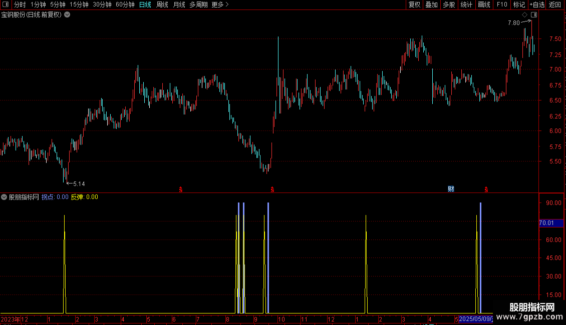 拐点:IF(BARSLAST(CROSS(慢线,开空))<P AND CROSS(慢线,开空) AND 慢线<20,90,0),STICK,COLORFF937F;