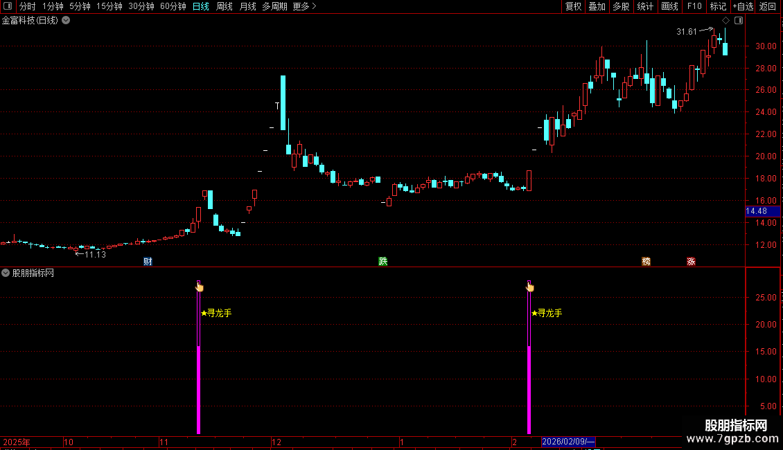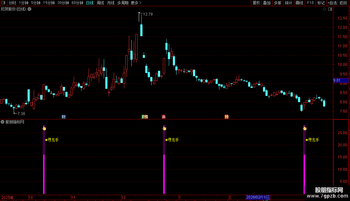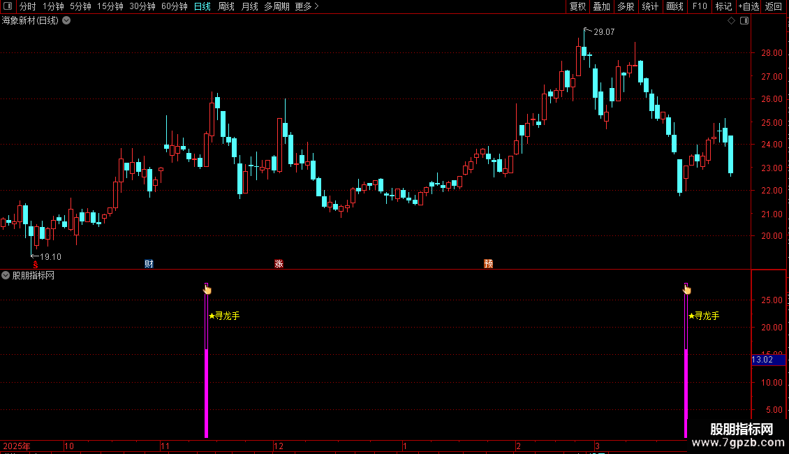 1. 副图指标:导入通达信后添加至K线界面,出现**青紫色信号柱+寻龙手文字+图标**时,为强势股启动信号,可重点关注。