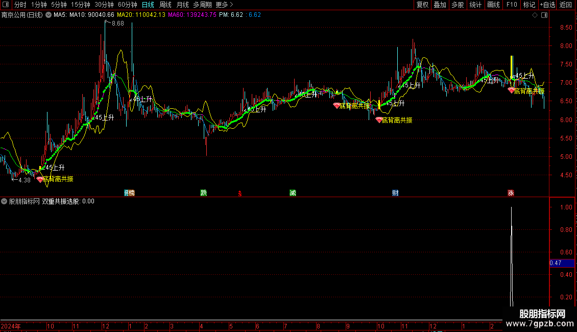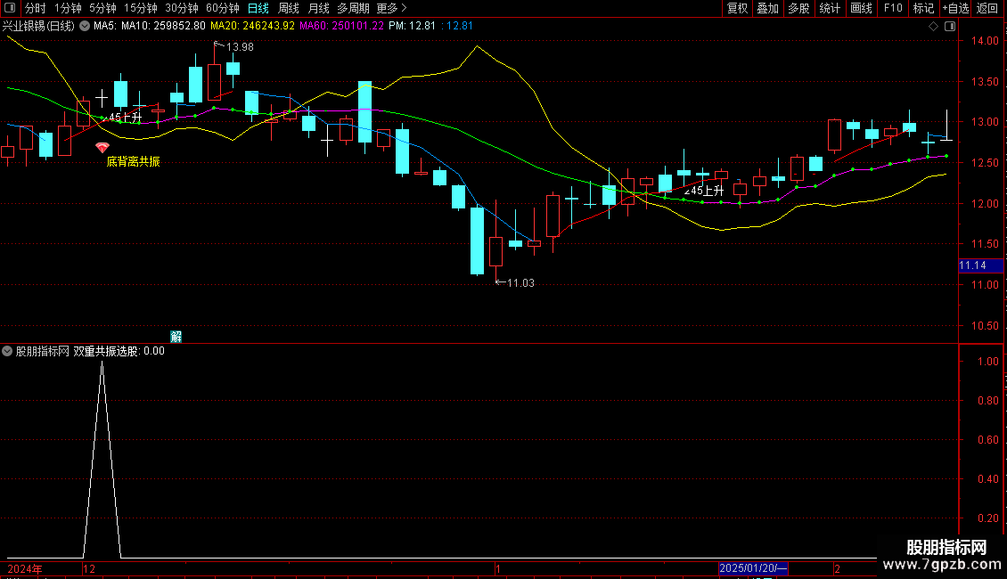 本指标核心优势的是“趋势+共振”双重验证,既通过∠45上升信号识别稳健趋势,又通过底背离+三底背离共振捕捉精准买点,同时搭配趋势线、均线变色辅助判断,直观易懂、实用性强。适合中短线投资者使用,重点关注“底背离共振”信号,结合量能和趋势确认,可有效提升操作成功率。