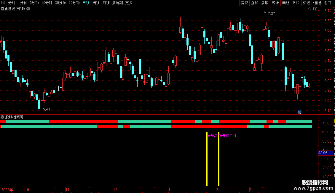指标是一个综合性的趋势判断系统,主要用于识别股价进入主升浪的启动时机,并直观展示当前股价所处的趋势阶段。它通过融合成交量、价格动量以及多周期均线排列来综合研判。当市场人气、资金动能和长期趋势三者形成共振时,指标会发出“★开启主升”的信号,提示可能出现一波强劲的上涨行情。
