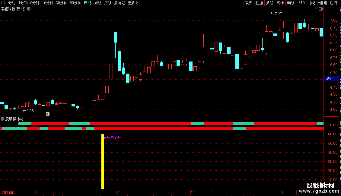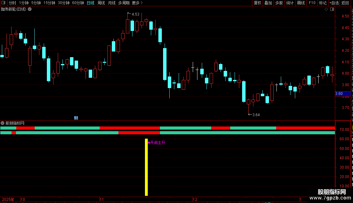 当图表上出现“★开启主升”标记时,可视为一个强烈的买入信号。同时,可参考图表中不同颜色的柱状体来辅助判断当前趋势的强弱和持续性。