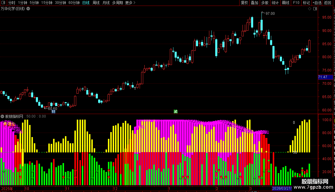STICKLINE(控盘度归一 >= 80, 控盘度归一, 0, 3, 0), COLORMAGENTA;