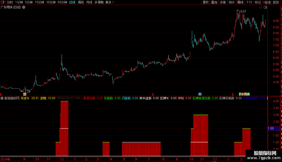 实板:=COUNT(日涨幅>=ZT_RATE AND 日涨幅=日峰幅,月谷时);