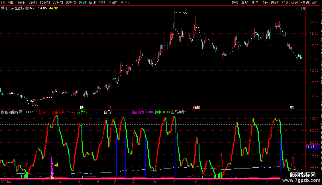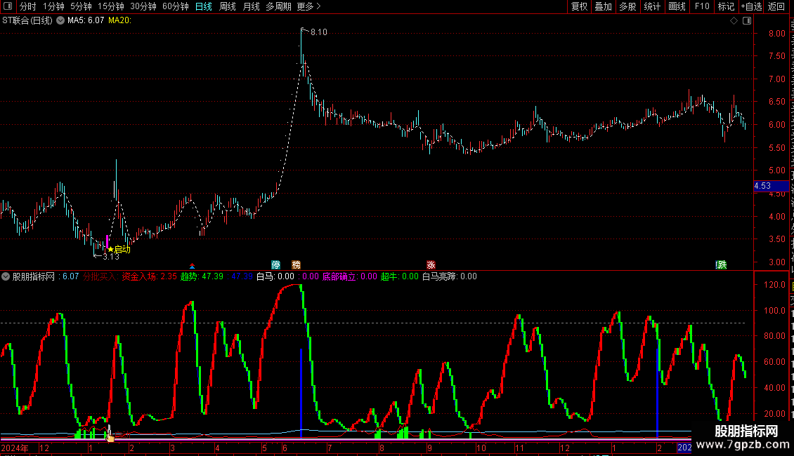 主图公式以MA5均线为基准,结合DMA动态均线、量价交叉信号及成交量放大生成“白马启动”信号,配合粉色柱状线与黄色“★启动”文字提示,直观显示买入时机。