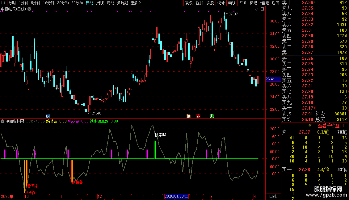 3. 逃离铁掌帮:当CCI从下方上穿200后出现“一峰低于一峰”的形态时触发,在副图0轴附近绘制绿色柱状标识。