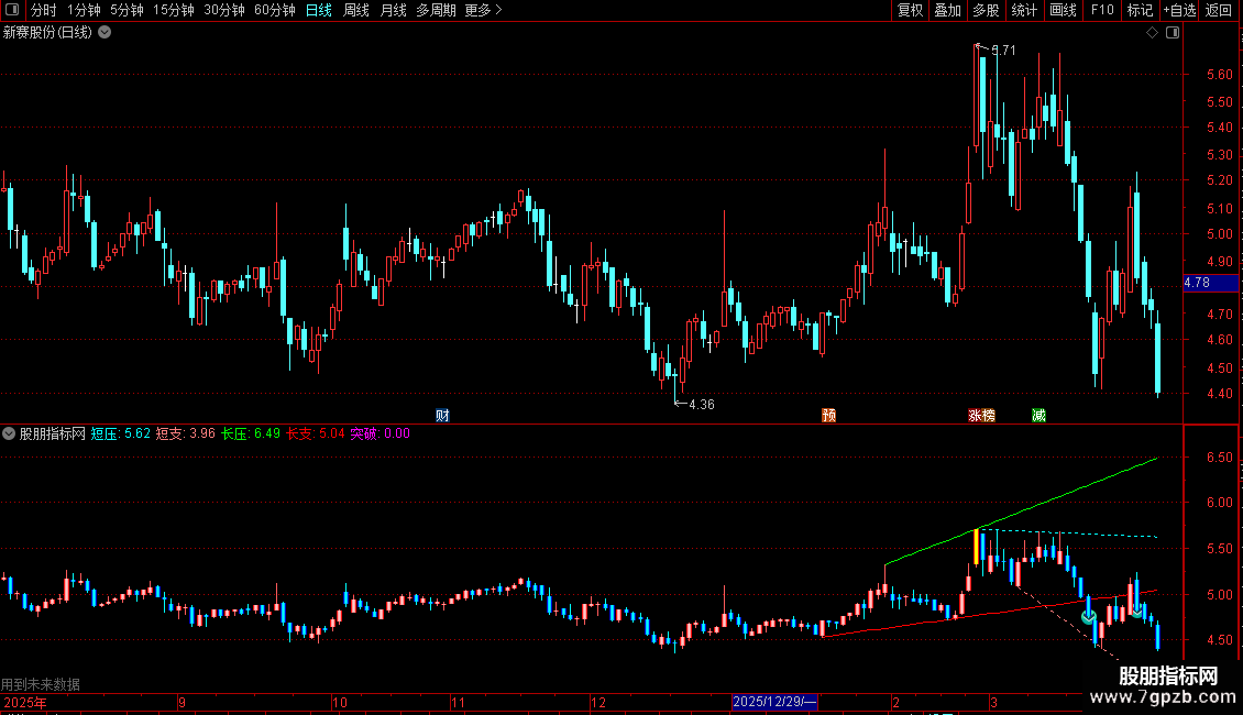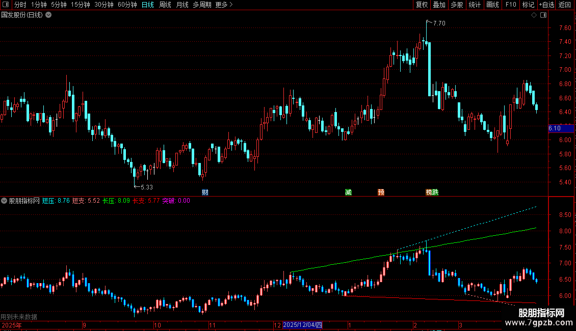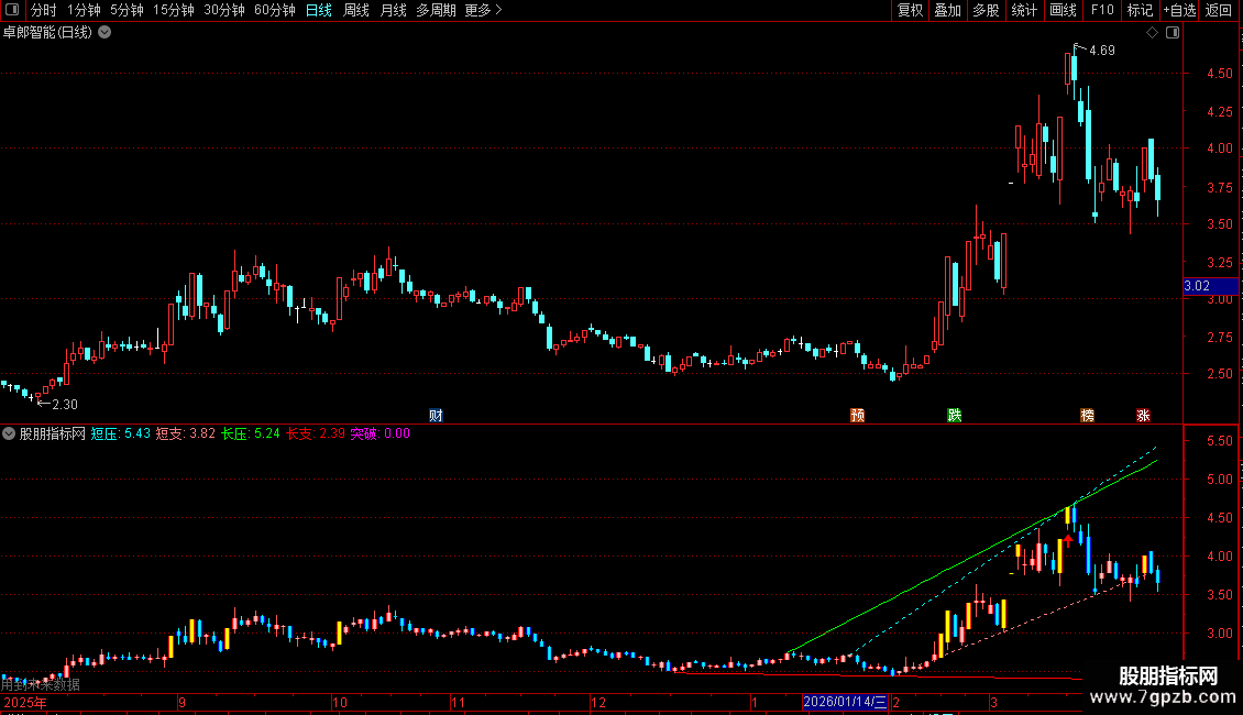 1. 压力与支撑线:自动绘制短期(青色虚线)和长期(绿色/红色实线)的压力与支撑线,分别基于5日和10日周期内的最高/最低价。