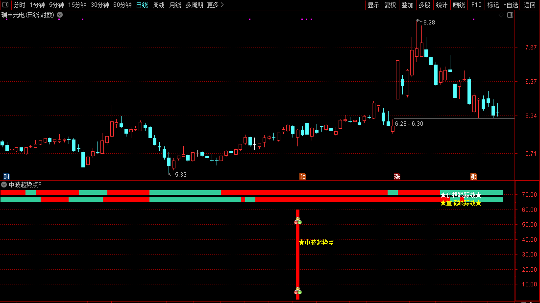当同时满足以下五个条件时,系统发出“中波起势点”买入信号: