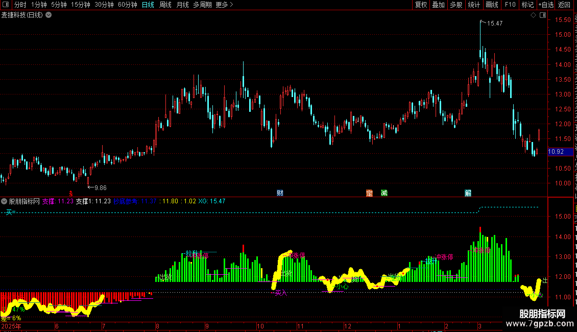 DRAWTEXT(FILTER(CROSS(C,REF(XG,1)),10) AND C>REF(XG,1),C*0.995,'突'),COLORYELLOW;