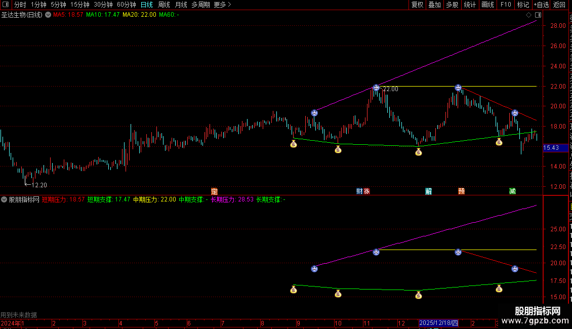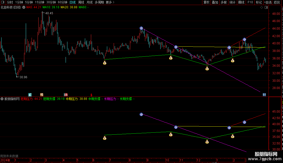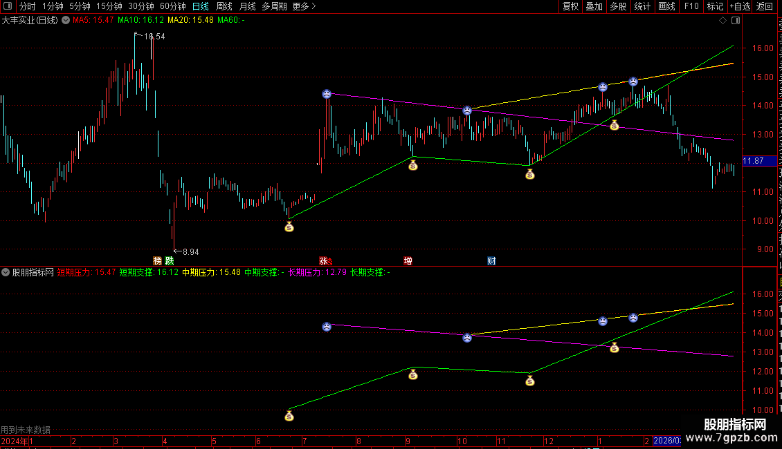 指标用于识别并绘制股价的支撑与压力线。它通过算法筛选出近期的高低点,并以此为基础,划分出短期、中期和长期的支撑与压力位。指标会在图表上直接画出这些水平线,并用图标标记出具体的高低点位置,帮助交易者判断关键的价格阻力与支撑区域。