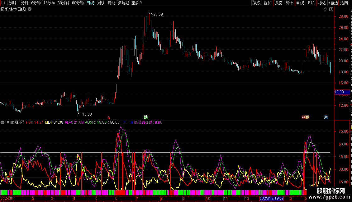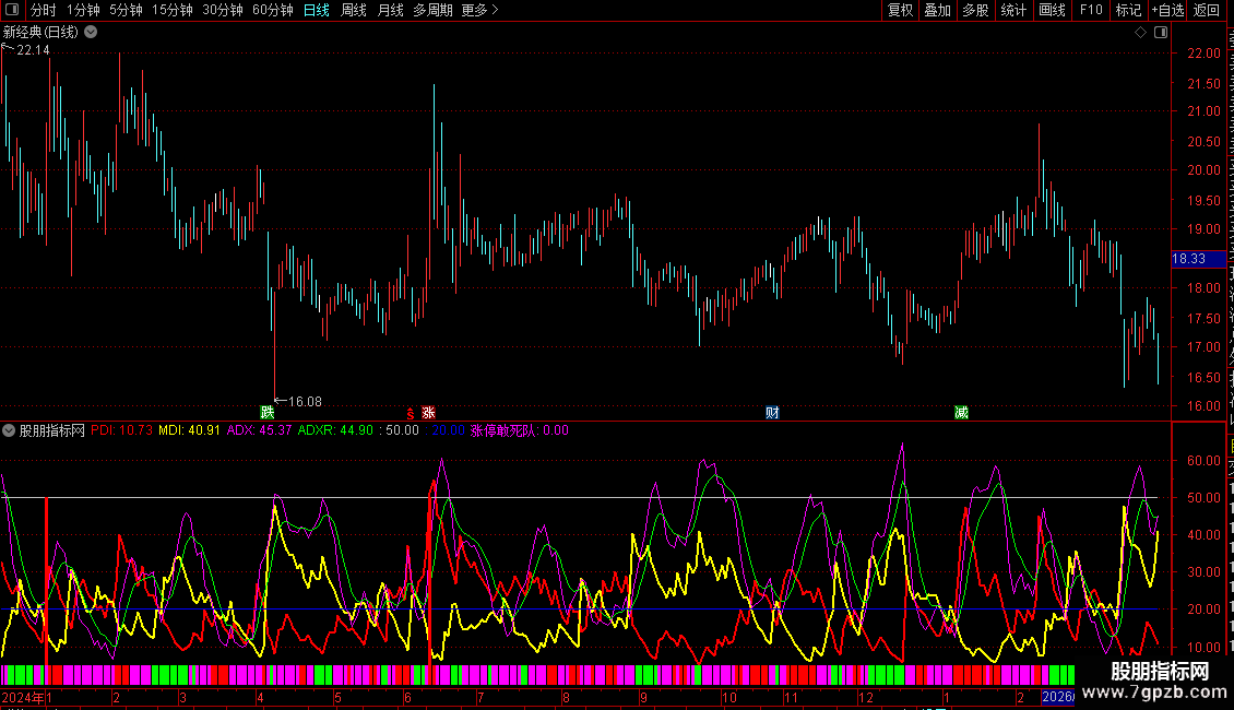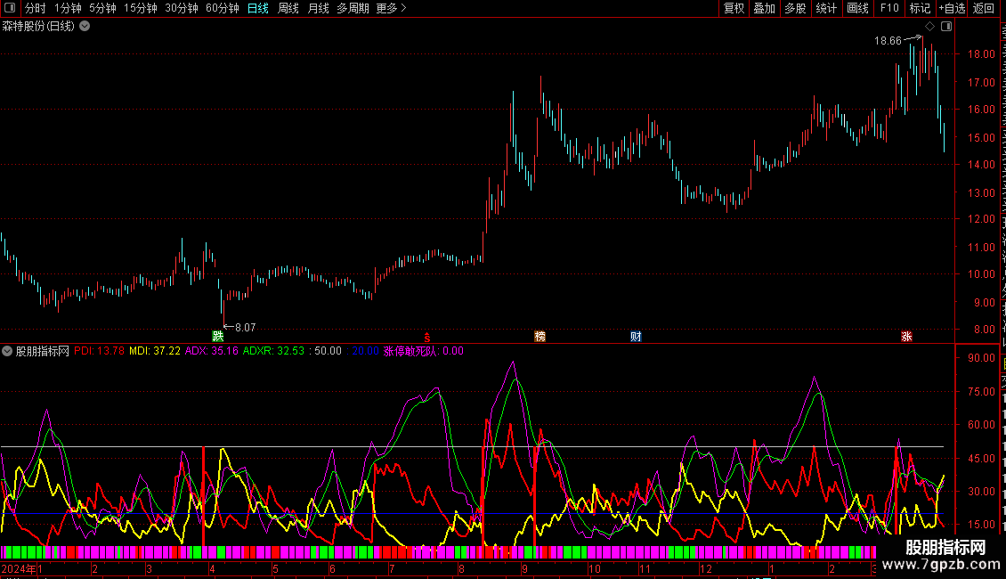 1. DMI/ADX系统:计算并显示PDI(上升方向线)、MDI(下降方向线)、ADX(平均趋向指数)和ADXR,用于判断趋势强度与方向。