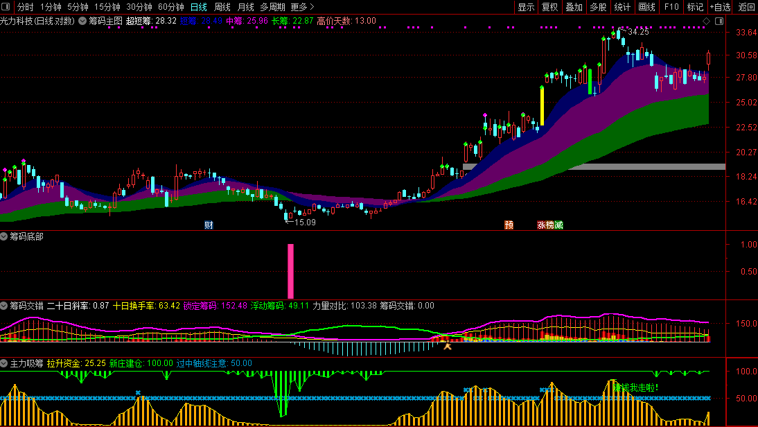 趋势确认:当获利筹码线稳定在亏损筹码线上方,且主力筹码线高于散户筹码线时,表明多头趋势健康,主力占据主导。