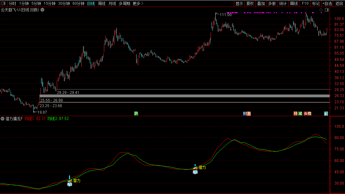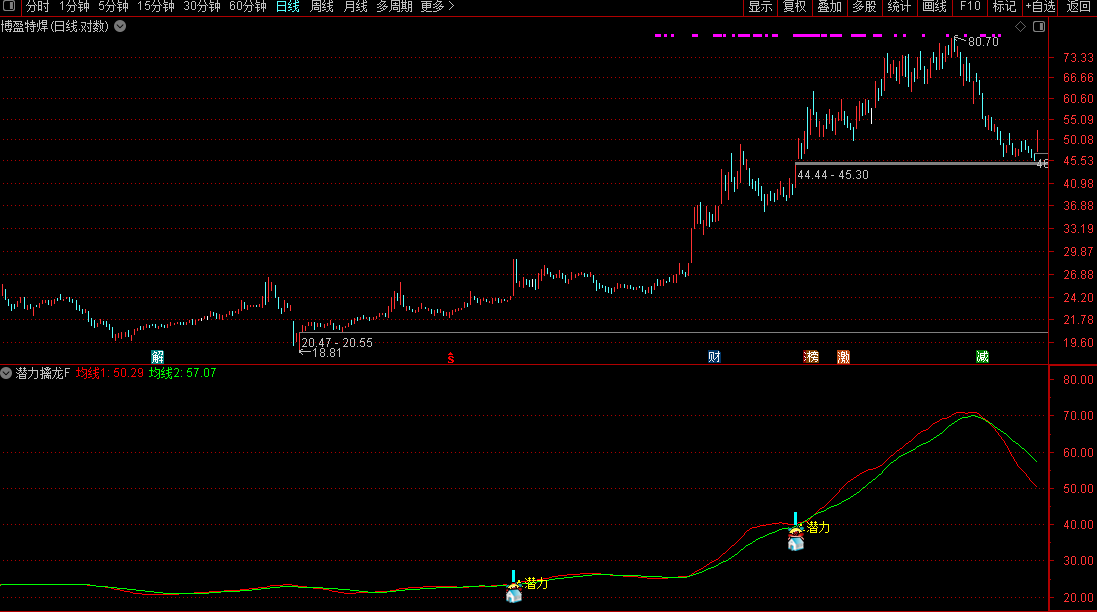 当副图界面出现彩色柱状信号,并伴随多个图标标记及“潜力”文字提示时,表示该个股满足综合选股条件。具体运用要点如下: