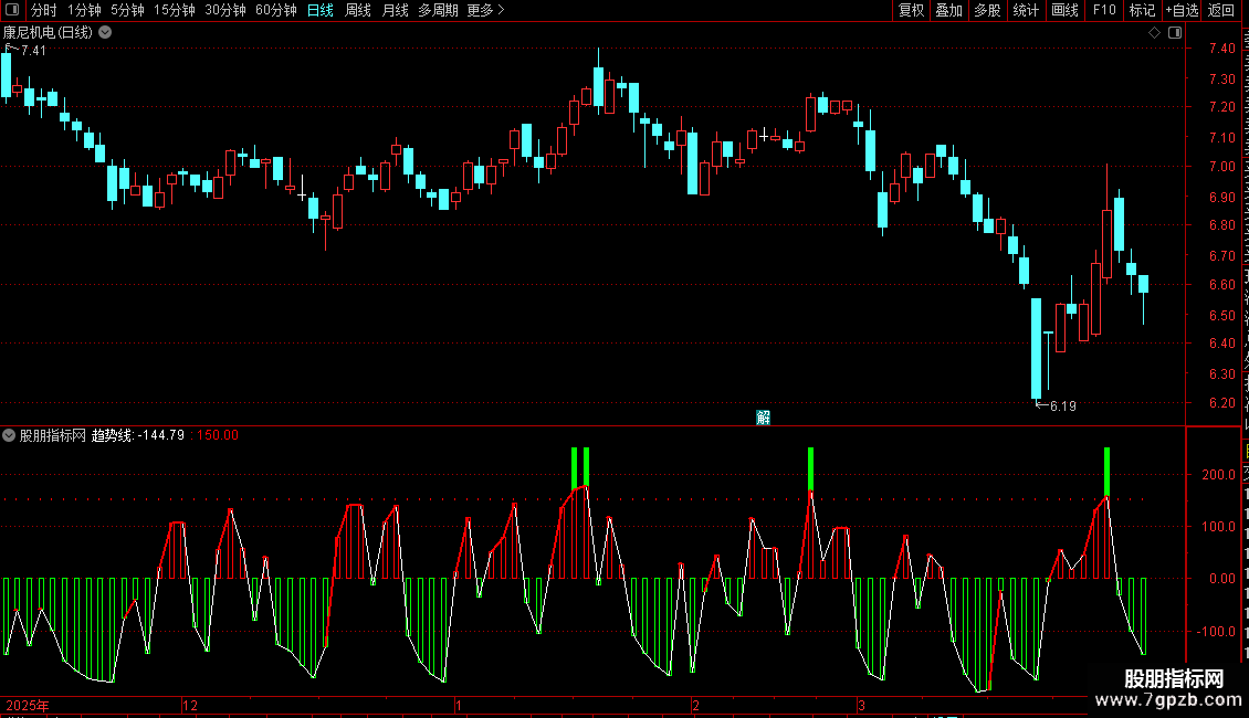 风险警示信号:当“趋势线”数值大幅攀升并超过150参考线,特别是触发顶部绿色警示区域时,需警惕股价可能过热,存在回调风险。