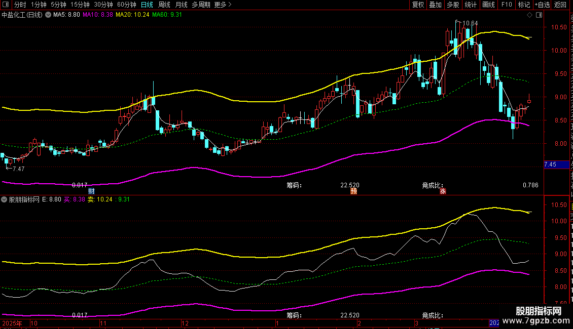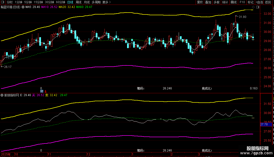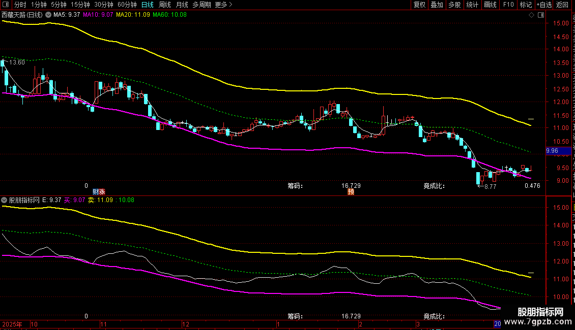 峰值:STICKLINE(ISLASTBAR,筹码峰,筹码峰,5,0)COLOR99FFFF;