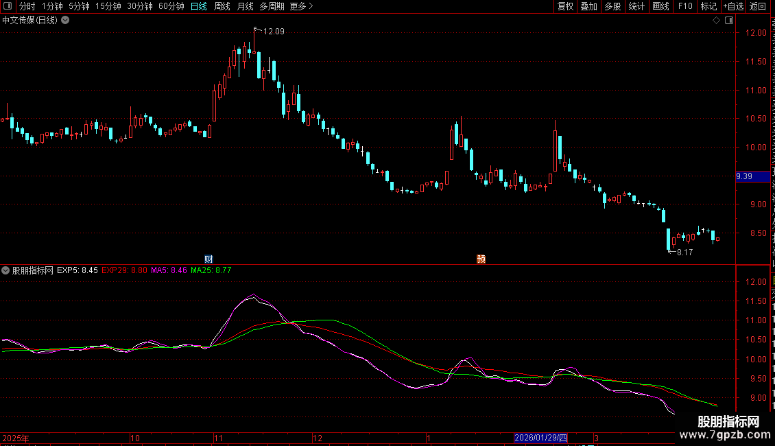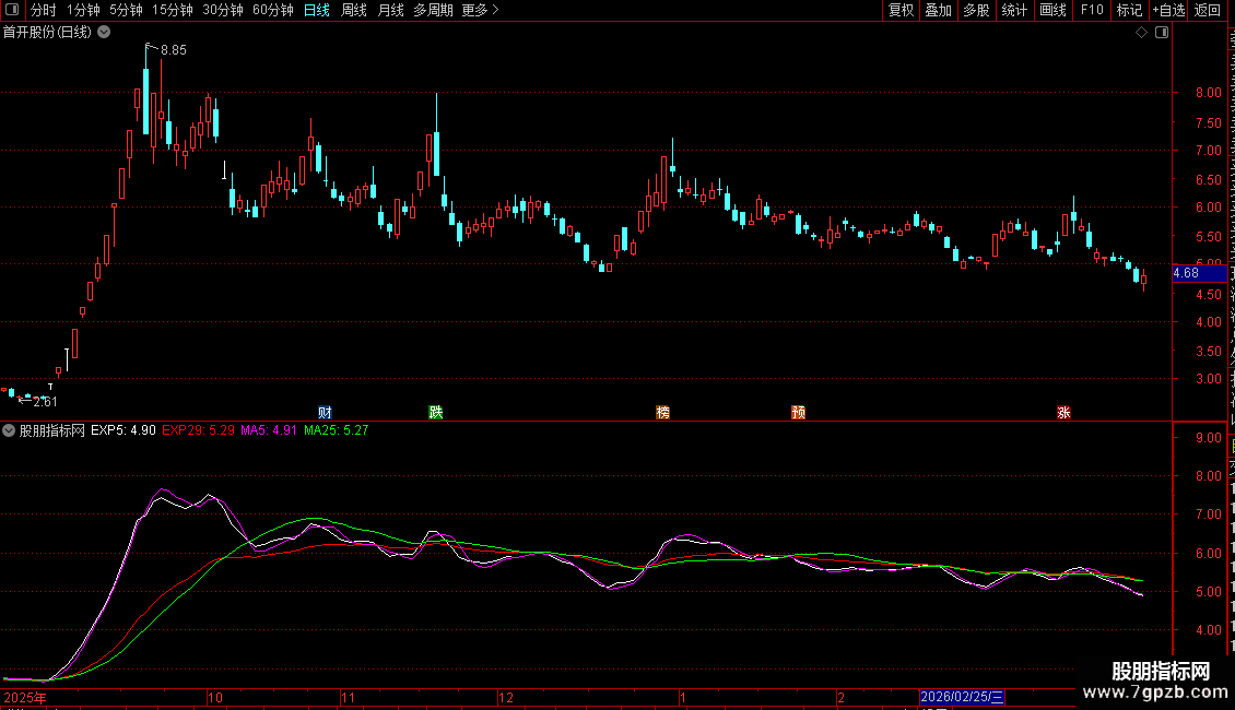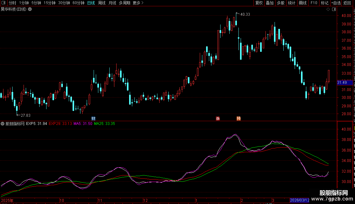 4. 均线系统:叠加了5日、25日简单移动平均线(MA)以及5日、29日指数移动平均线(EXPMA),用于判断趋势和支撑压力。