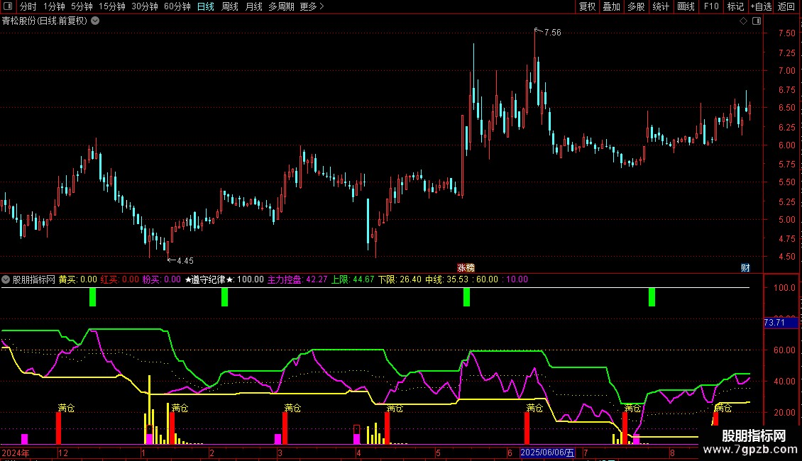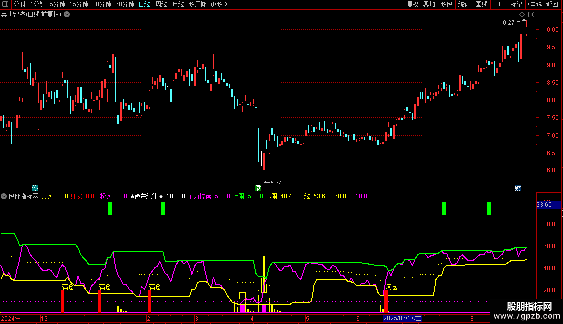 4. 操盘线满仓信号:基于价格在20日内的相对位置,经过平滑处理后产生交易信号。当操盘线上穿且处于极低位时,提示“满仓”机会。