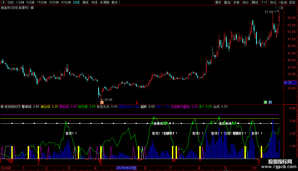 1. 动力线与风控:通过“动力线”上穿三条预设的警戒线(警戒线、减仓线、卖出线),发出明确的文字和图标警示信号,提示警惕、减仓或出局。