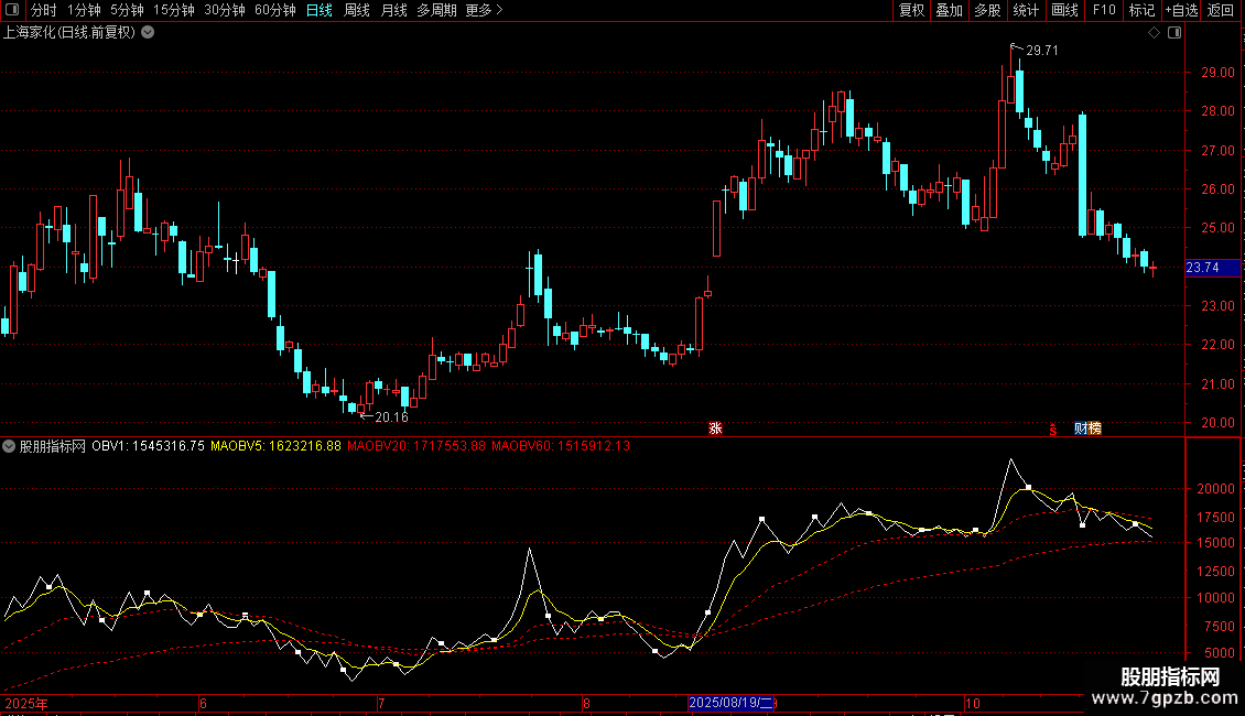 核心功能是计算OBV值,并依据不同周期(如分时、日线、周线等)动态调整均线计算参数,生成5倍、20倍和60倍周期参数的指数移动平均线(EMA)。其中20倍和60倍周期均线以红色虚线显示。