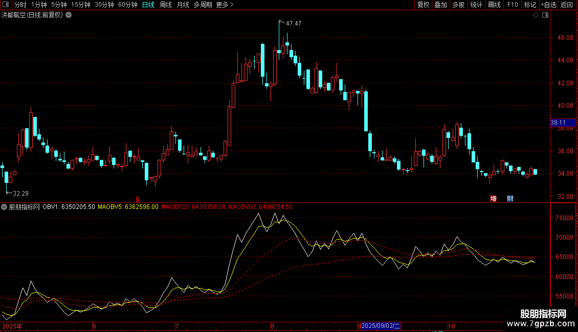 指标是一个基于成交量与价格关系的能量潮(OBV)及其均线系统。
