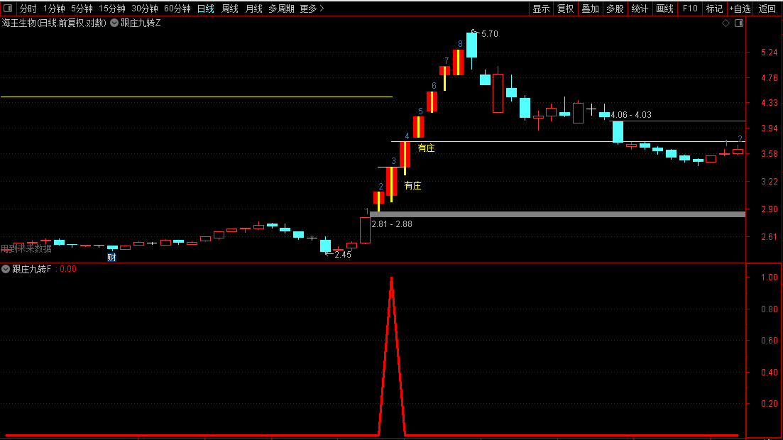 更值得一提的是“有庄”提示和数字“9”的转点信号。当股价在特定结构下连续上涨,第九天往往成为变盘窗口,主图上会直接标注出来。再配合副图的RS强弱指标和吸筹区域判断,何时该持有、何时该警惕,一目了然。