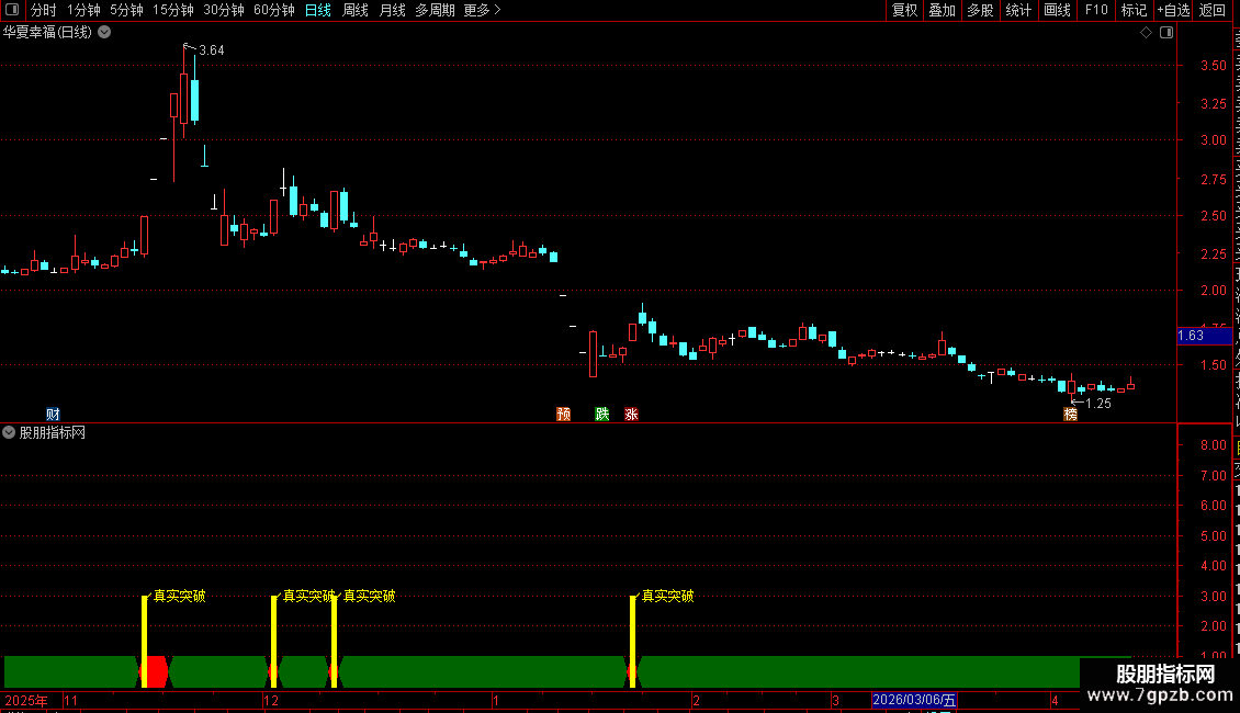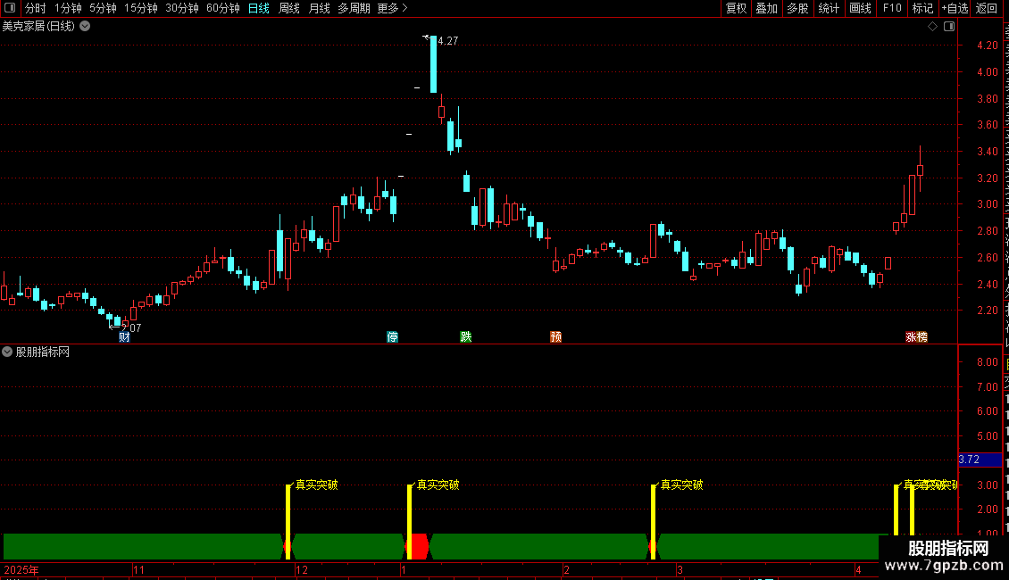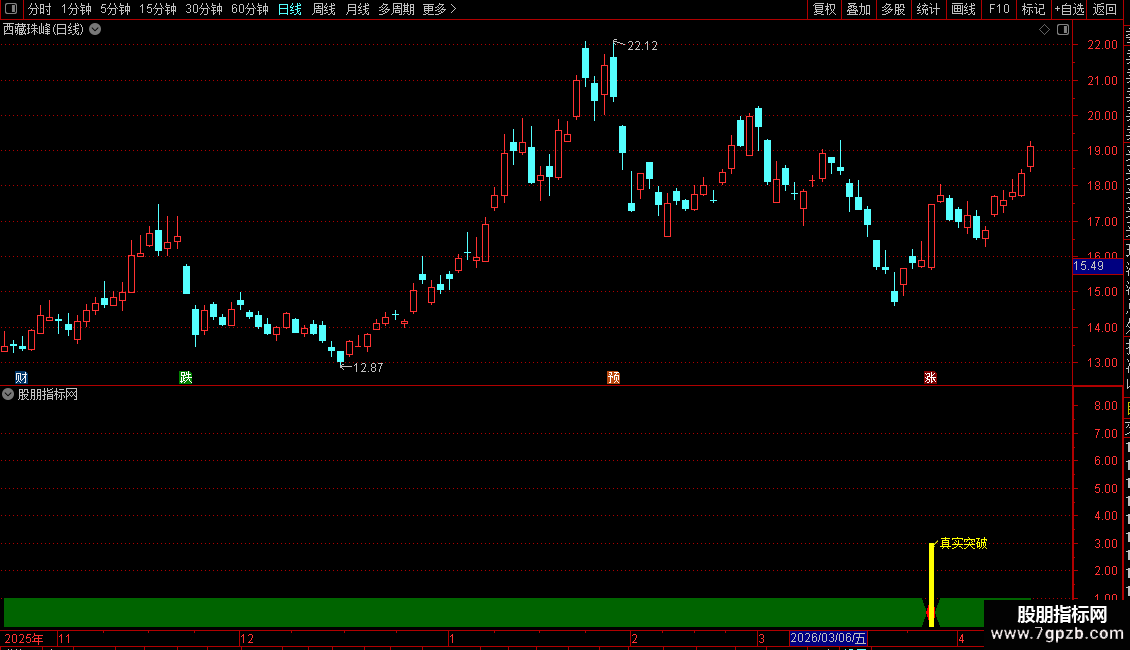 DRAWTEXT(BARSLAST(VAR23< 1)=1 AND VAR23=1,3,'↙真实突破')COLORYELLOW;