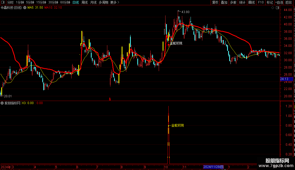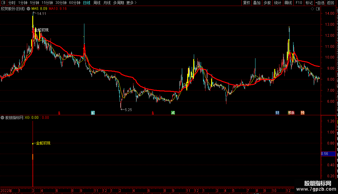 DRAWTEXT(XG,0.8,'---金蛇初现'),COLORYELLOW;