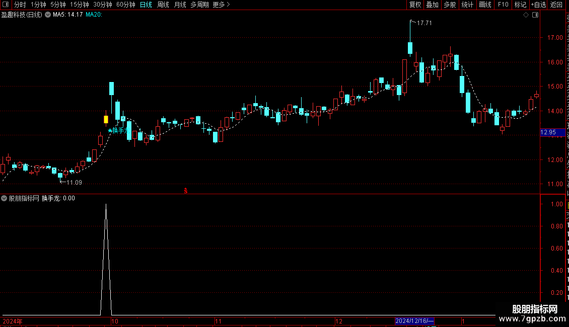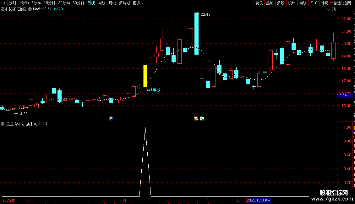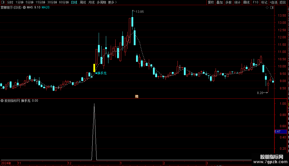 1. 主图公式:安装至通达信主图指标,信号触发时自动标注青色K线+黄色★换手龙字样,即为最佳介入信号;