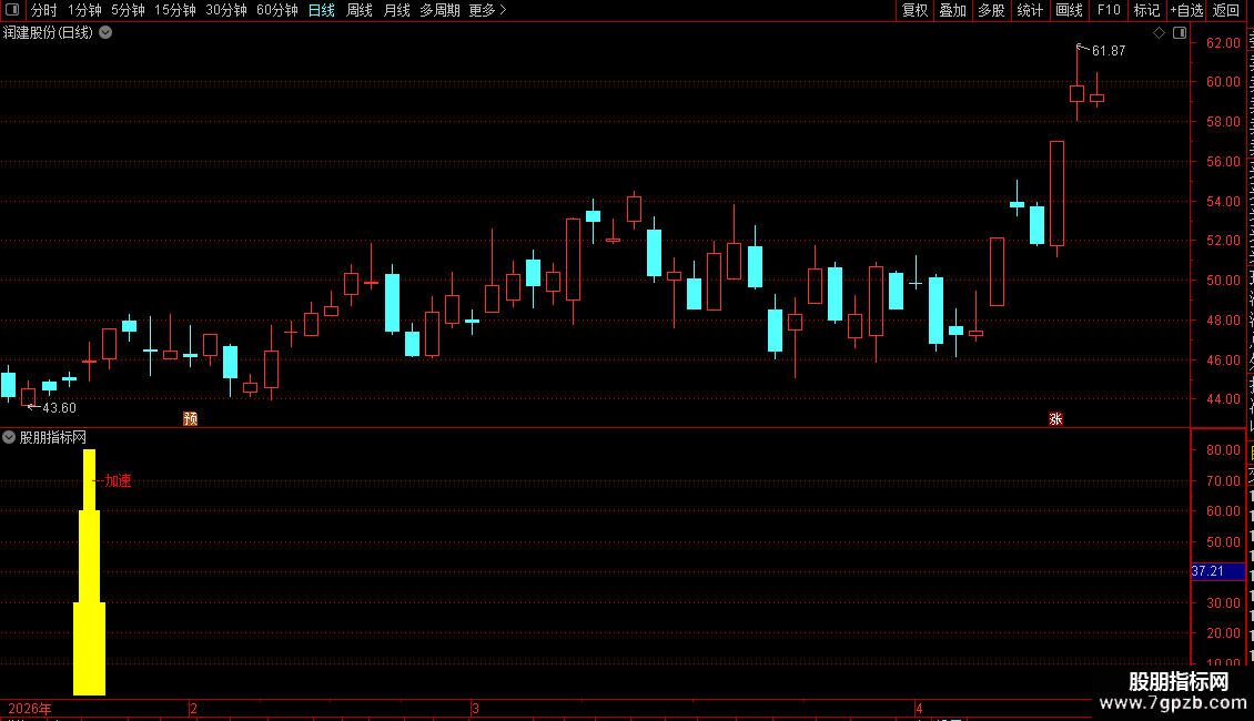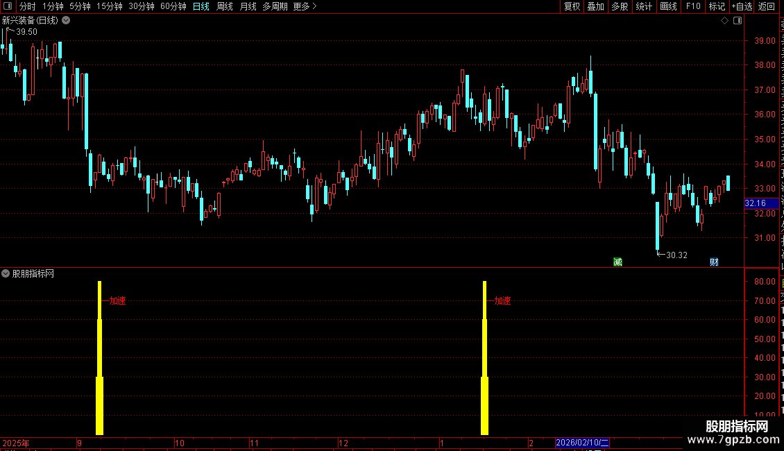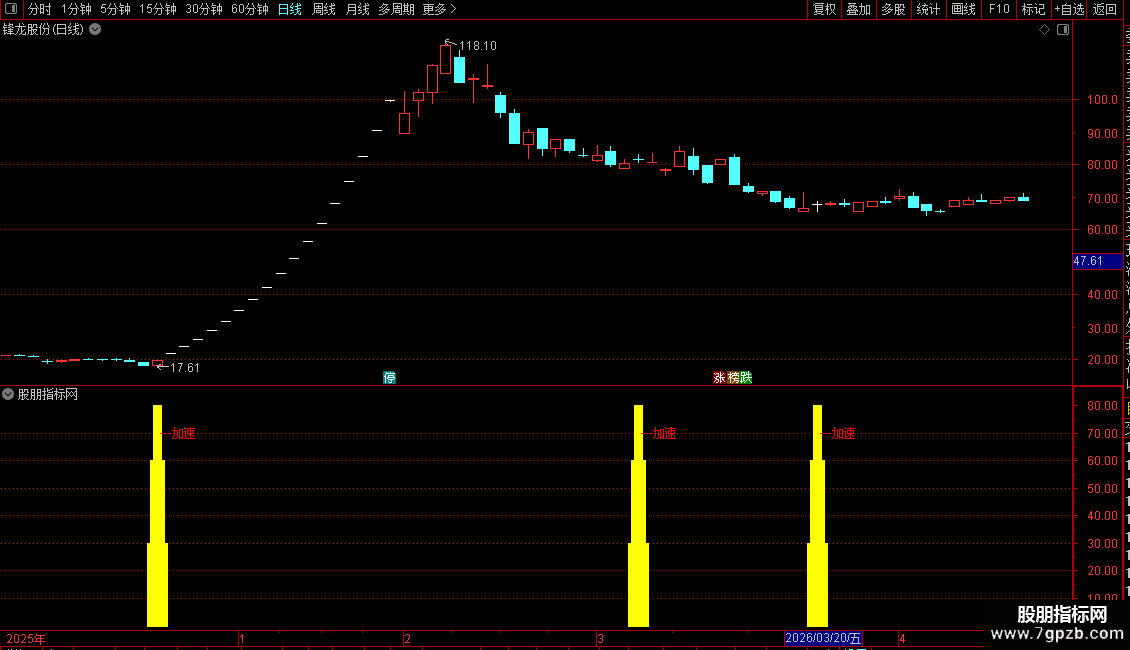 1. 信号识别 :副图出现 青黄色柱状信号+红色【加速】文字 ,为核心买入信号;