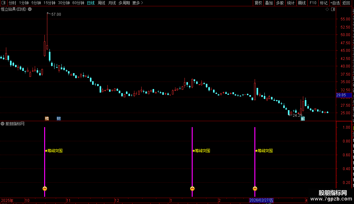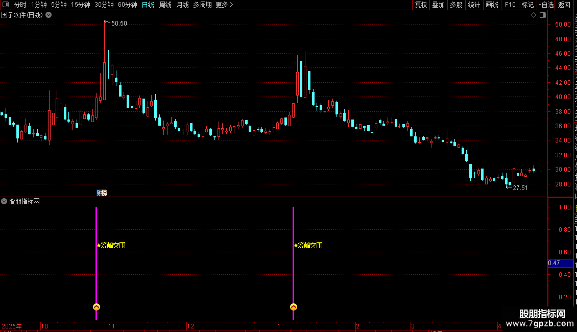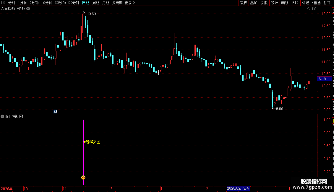 1. 副图指标:出现粉色柱体+★图标+「筹峰突围」文字,即为标准买入信号;
