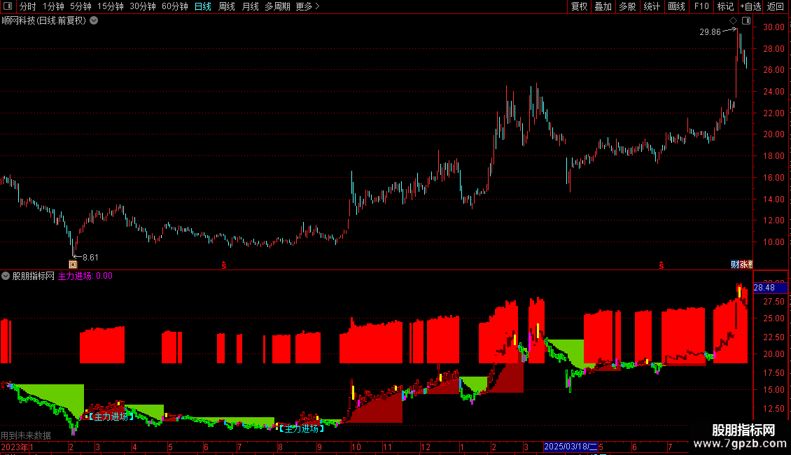 5. 主力进场信号:结合价格在布林通道内的相对位置和持续状态,当满足“主力潜伏”条件被打破时,在K线下方标注“【主力进场】”文字,并用黄色K线和特殊标记进行突出显示,提示可能的资金入场点。