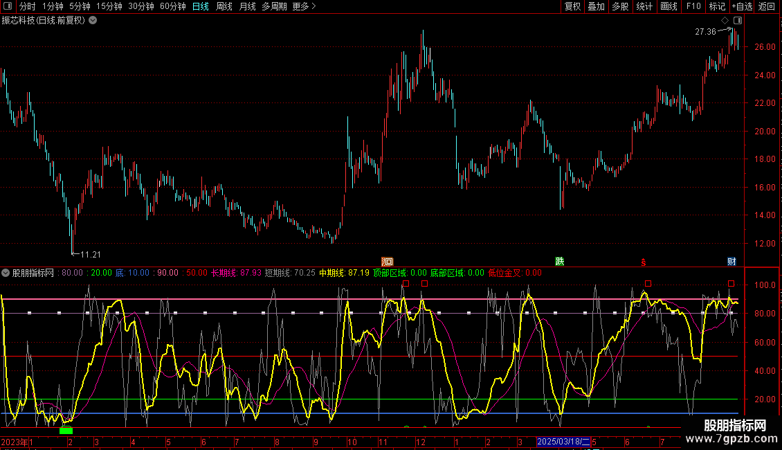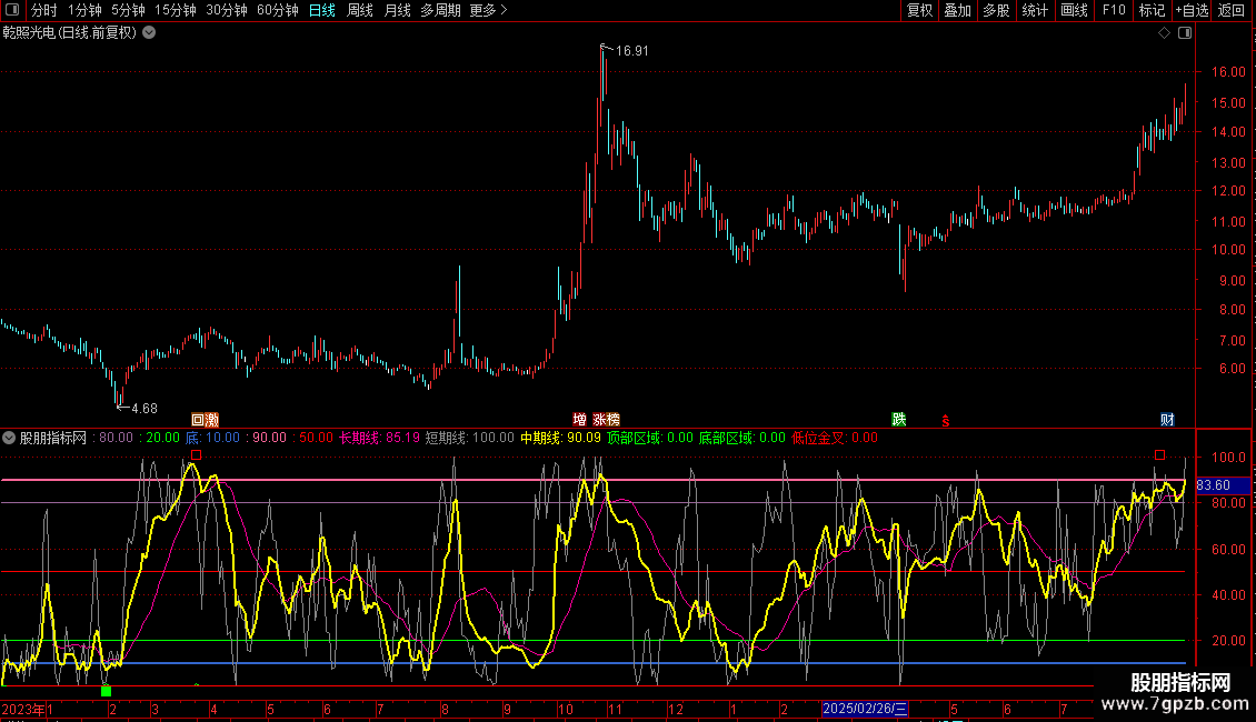 趋势与信号:关注三条曲线的排列(多头或空头)与交叉。结合“顶部/底部区域”预警和“低位金叉”买入信号进行操作。