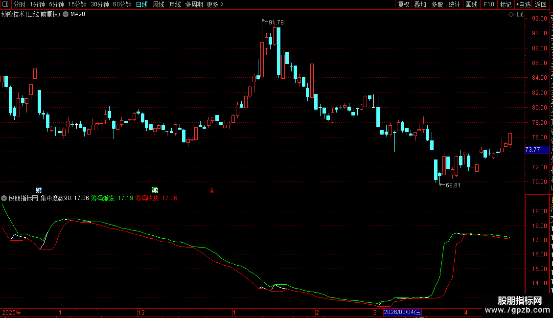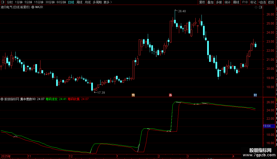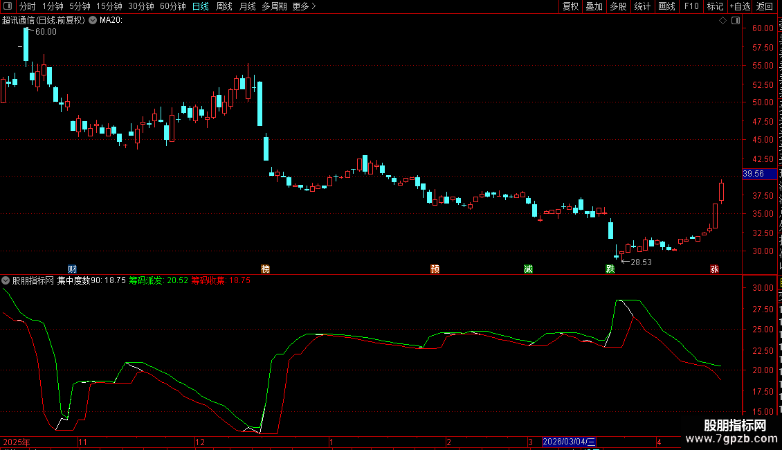 输出筹码派发:4日内集中度数90的最高值,画绿色