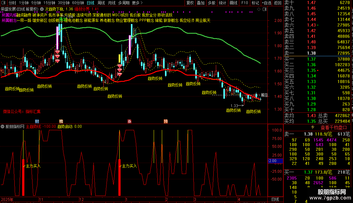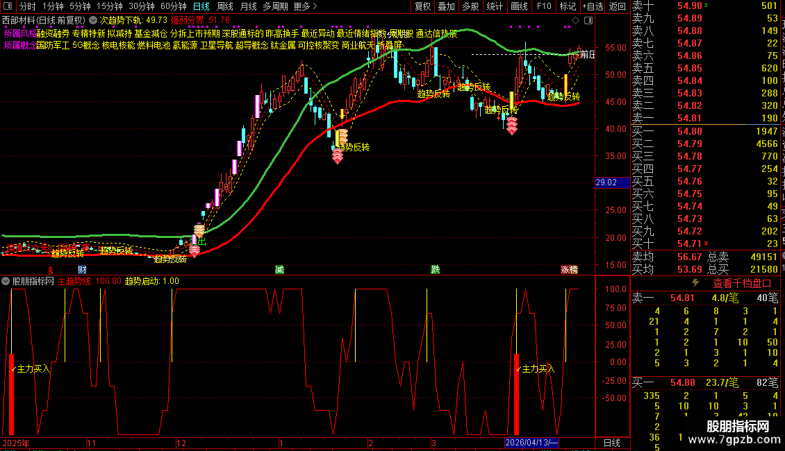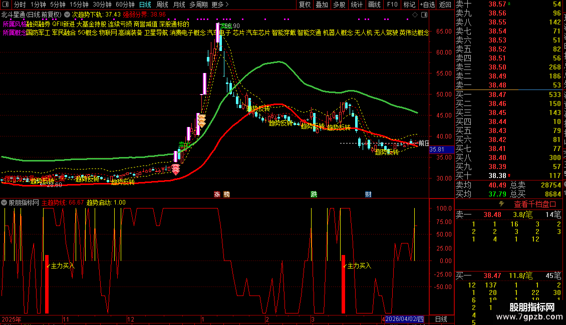 3. 主图中的趋势反转信号代表行情可能发生反转,此时投资者需要将该股加入自,密切关注后续走势。该信号是趋势跟庄指标的核心之一,能提前预警潜在的上涨或下跌行情。