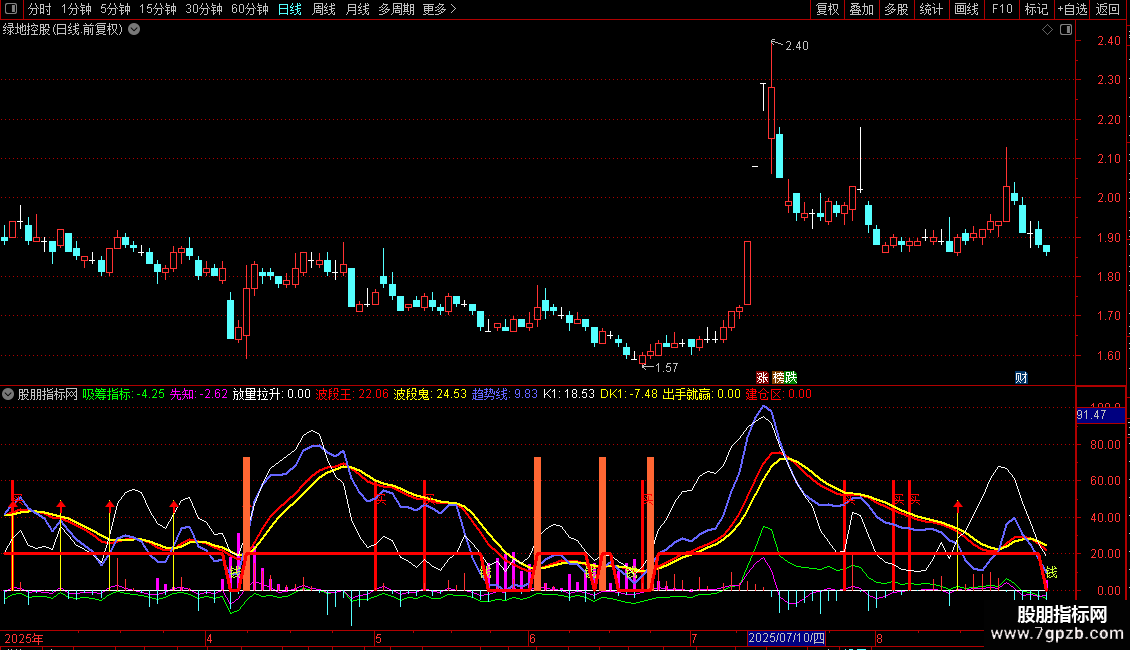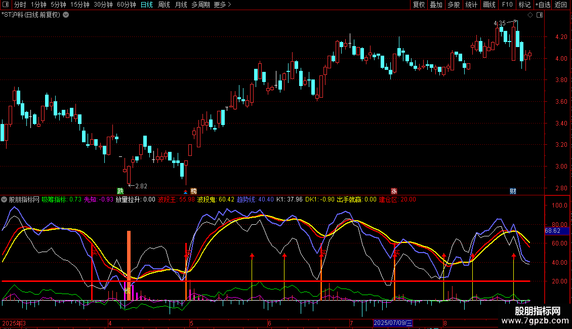 2. 波段趋势跟踪:通过“波段王”、“波段鬼”和“趋势线”三条曲线,描述股价的短期波段强弱和趋势方向。其金叉、死叉及上穿下穿关键值(如10)可作为买卖参考。