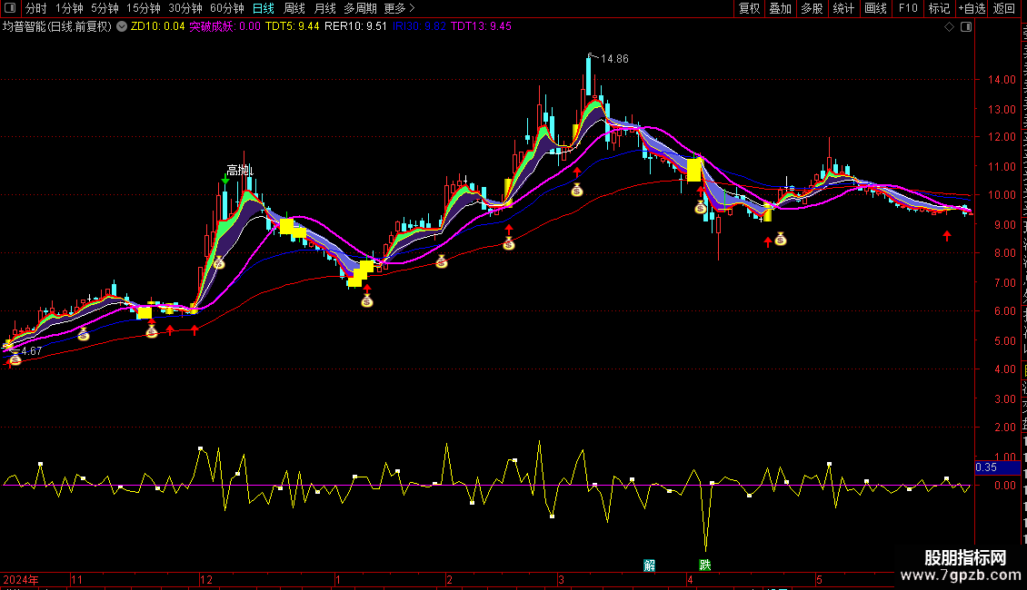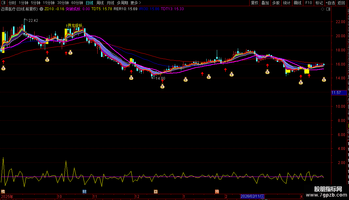 2. 波段低吸:出现红色渐变柱+红三角图标,代表均线金叉叠加低位估值,可逢低布局;