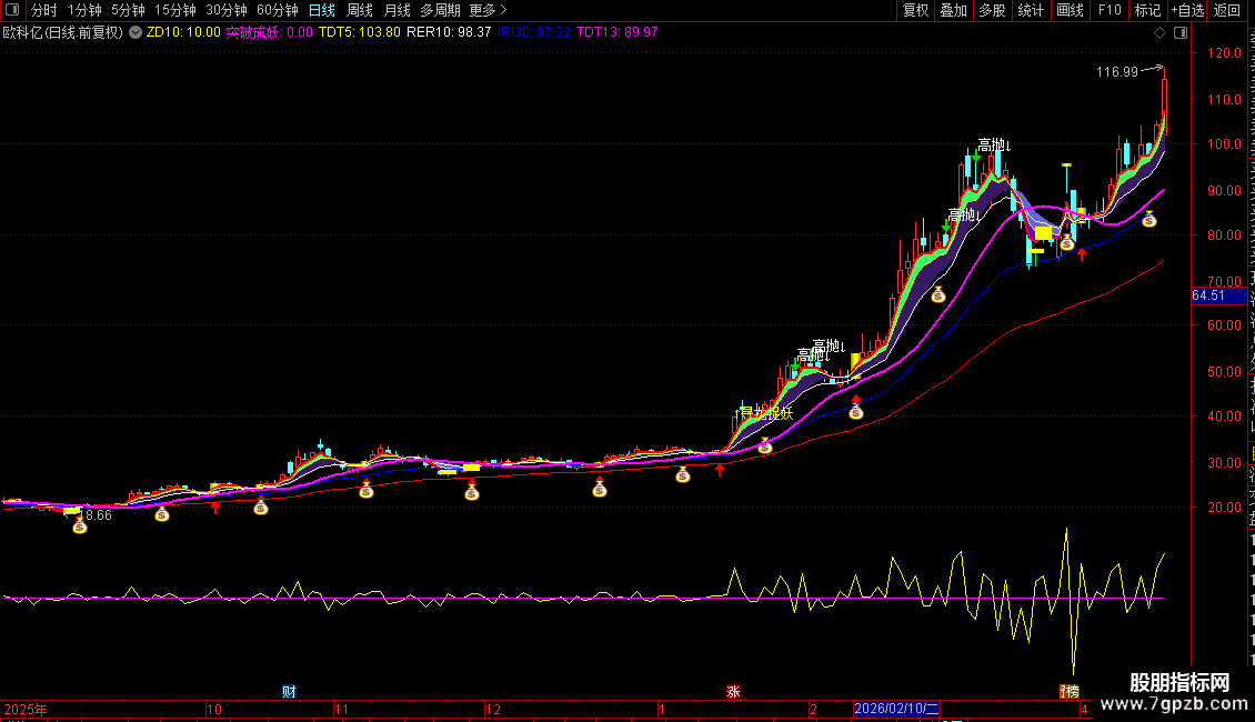 6. 止盈信号:K线上方出现白色“高抛↓”,代表指标进入超买区间,需及时止盈离场。