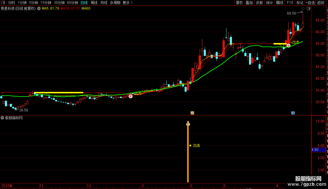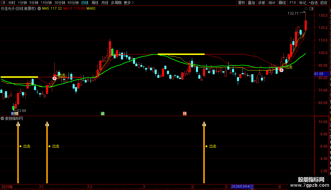 2. 副图:红色柱状+★出击信号共振,确认入场时机,提升操作准确率;