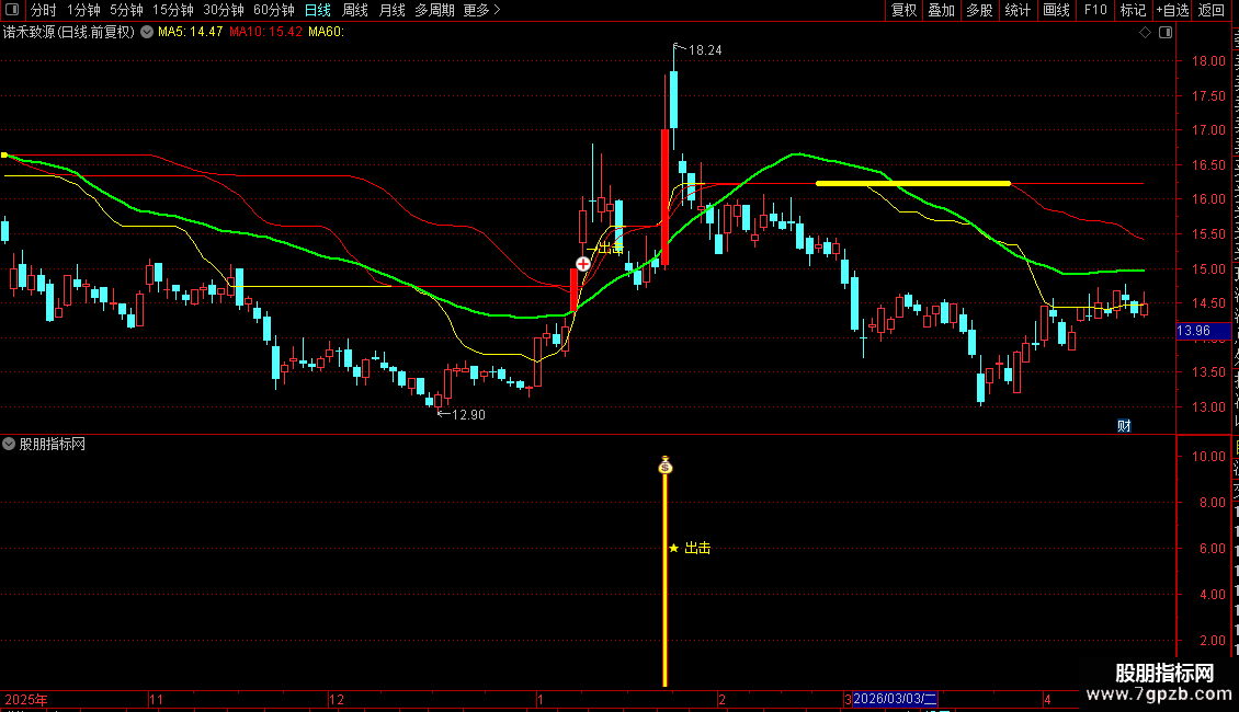 1. 主图:出现**→出击**文字+图标时,为短线入场参考信号,绿色线为压力参考;