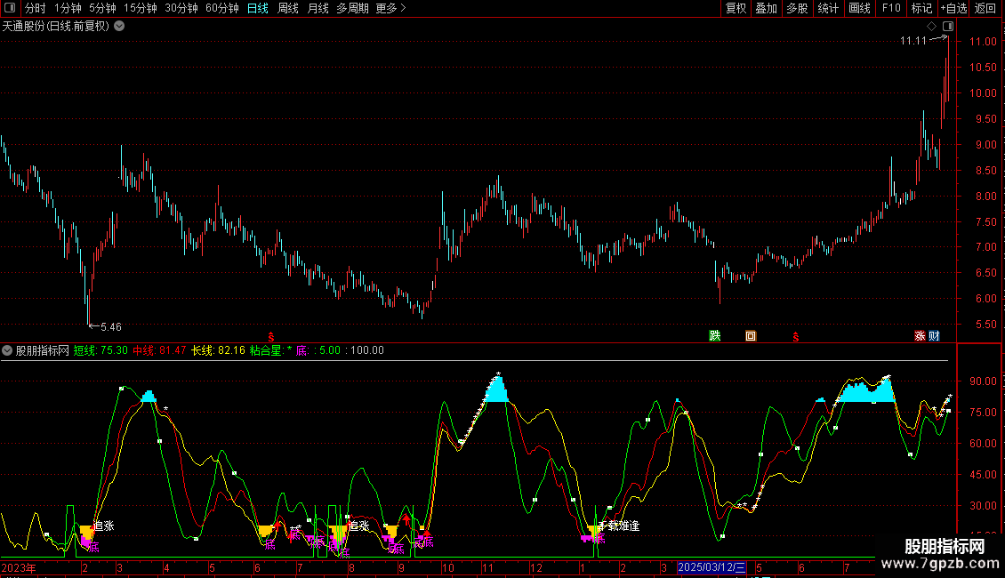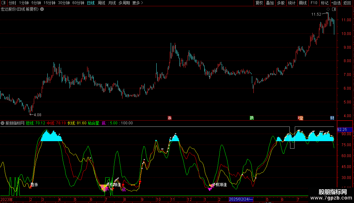 底:DRAWTEXT(CROSS(中线2,-90) AND (长线<中线 AND 长线>REF(长线,1)OR 短线<20 AND 中线<20 AND 长线<20),长线,'底'),COLORFF00FF;