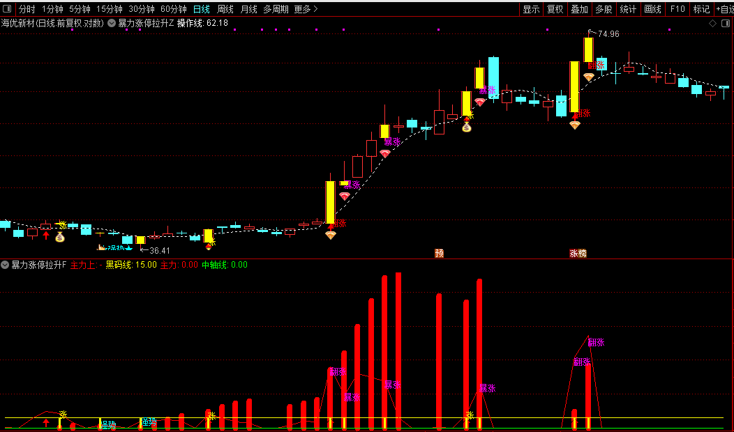 1、当"主力"值超过黑马线(15)且"主力上"大于0时,若主力值在30至70之间,则标记为“暴涨”红钻石信号;若主力值在15至30之间,则标记为“涨”钱袋子信号;若主力值大于80,则标记为“翻涨”黄钻石信号。