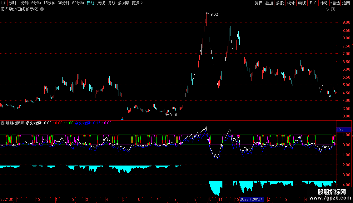空头力道:用最低价减去13日均线,用蓝色线显示。同时,在图表下方用独立的紫色和青色细柱状图来可视化其正负值。