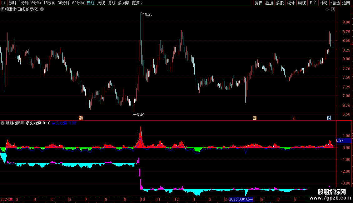 用法:观察红绿柱状图(多头力道)与下方紫青细柱(空头力道)的协同变化。当红色柱状图放大且下方紫色细柱同步放大时,表明上涨动力强劲。反之,绿色柱状图与青色细柱的组合则表明下跌动力占优。可用于辅助判断短期多空力量的转换。