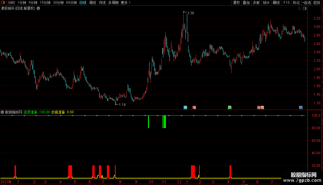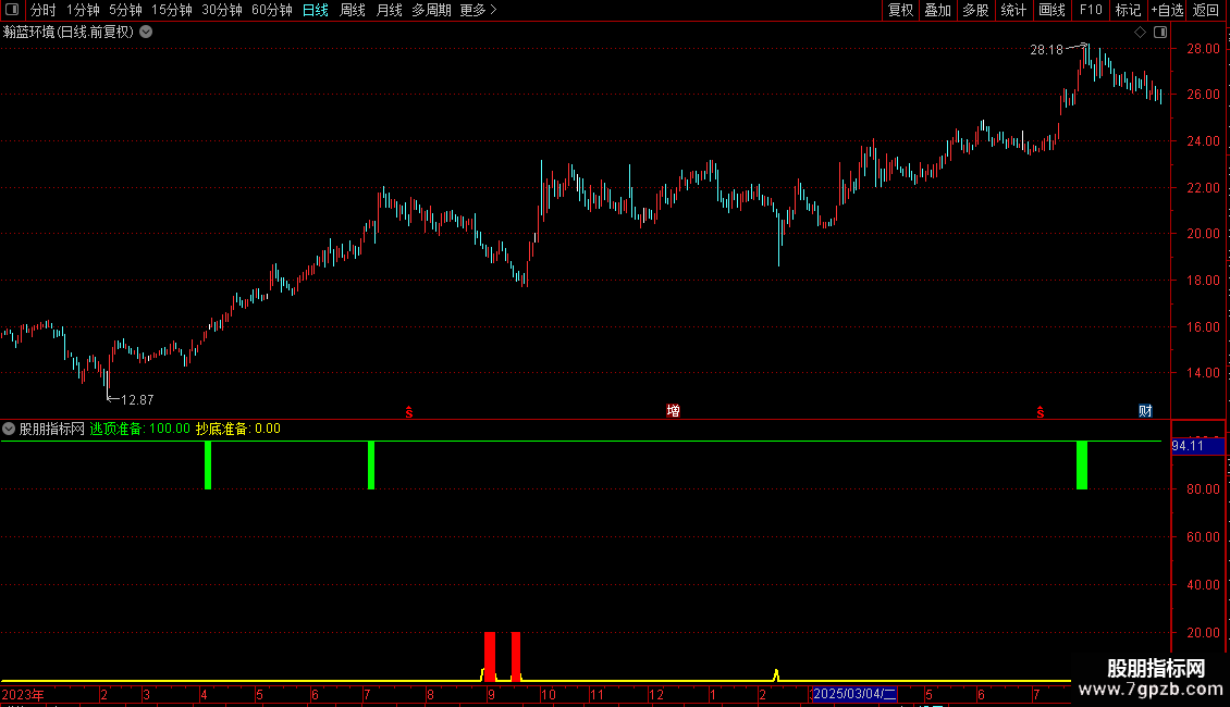 - 逃顶准备:当短期随机指标高位死叉且数值超过95时,提示风险,标记为绿色信号。