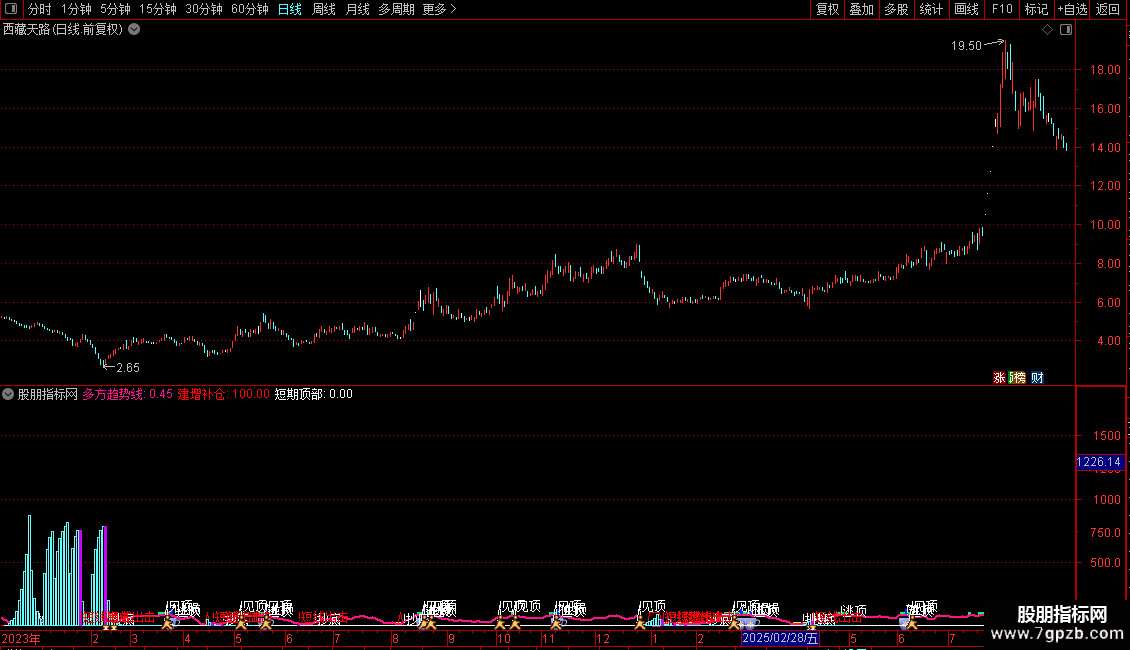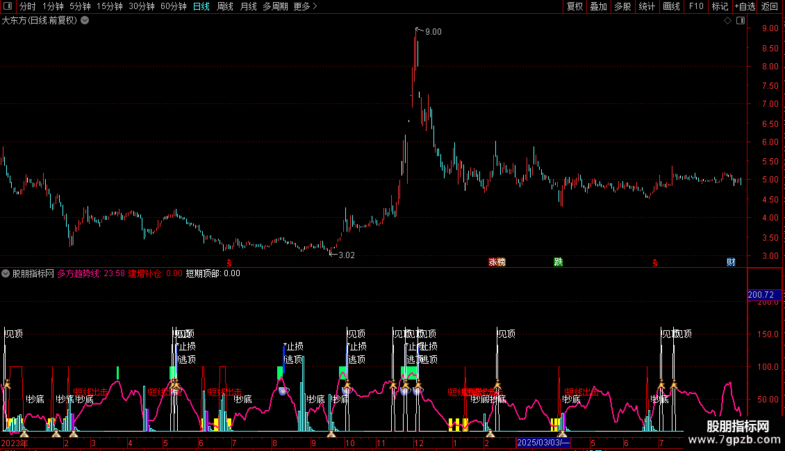 1. 趋势判断:通过“股价趋势”和“多方趋势线”识别市场整体趋势方向。