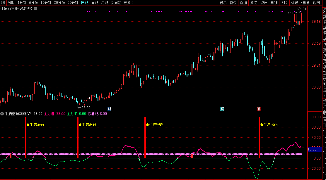 1. 副图指标:安装后加载至个股K线,**紫色主力进线**上穿粉色标准线、出现红色「★牛启密码」信号柱,为核心买入提示;绿色主力出线代表资金出逃,及时止盈止损。
