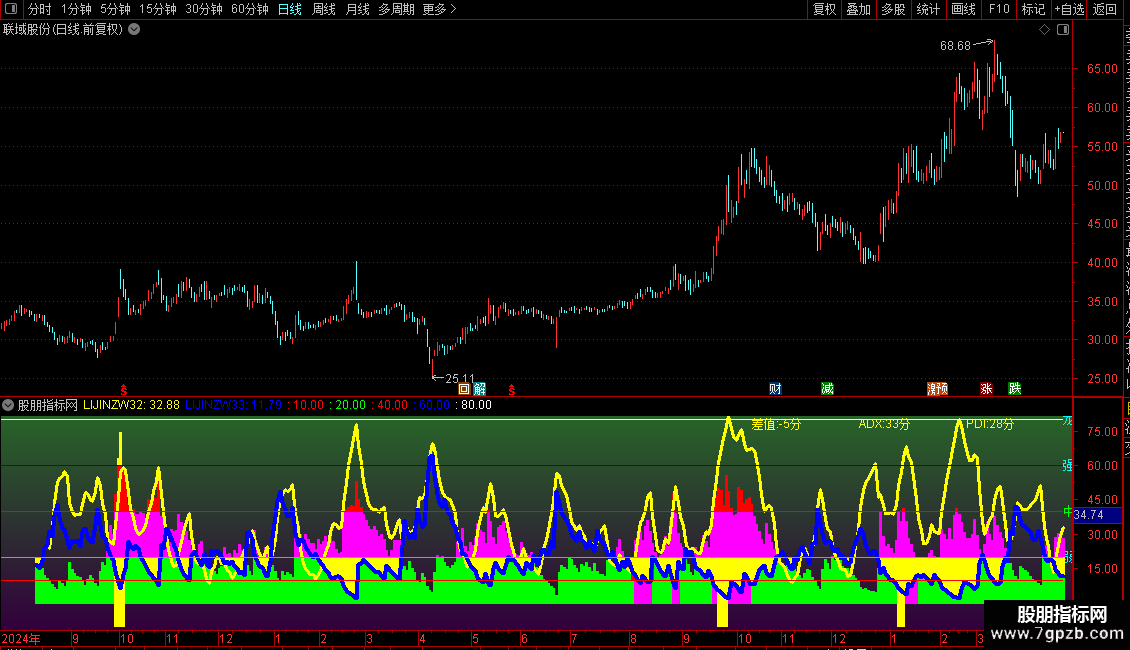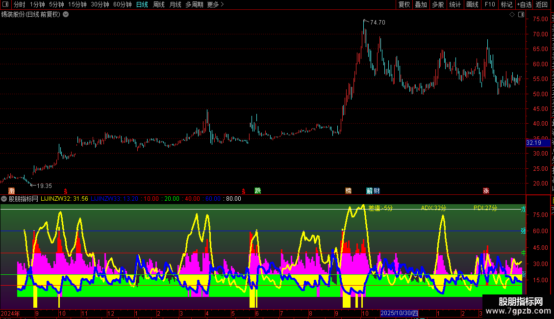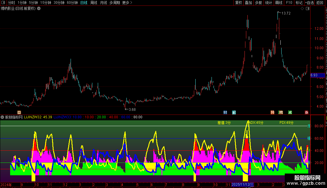 动能与转折信号:指标中包含一条关键的黄色曲线,它反映了趋势的强度。当这条曲线数值较低并开始回升时,往往预示着原有的下跌趋势正在减弱,可能出现反弹或反转。同时,指标还会在特定条件下发出信号,提示投资者关注市场动能的突然变化。