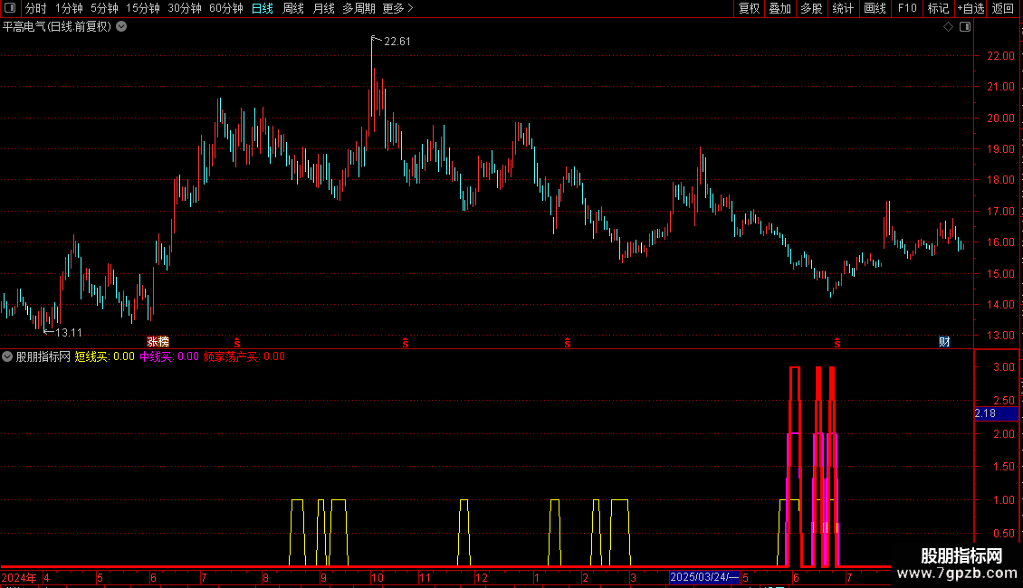 短线买:IF(绝佳买点>500 AND 绝佳买点>2500,1,0),COLORYELLOW,LINETHICK1;