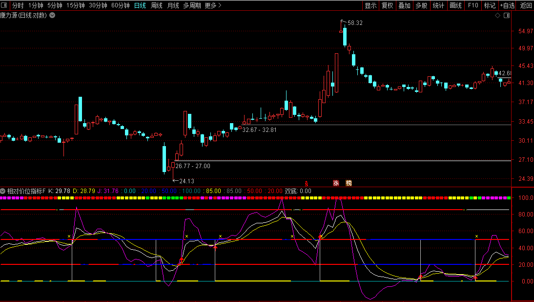 相对价位 J 值在低位(0~20)金叉,配合 OBV 红线、MTM 红线,胜率更高
