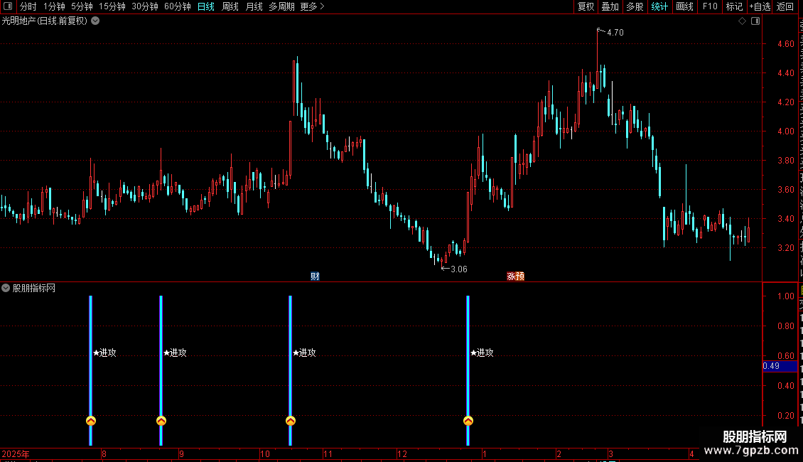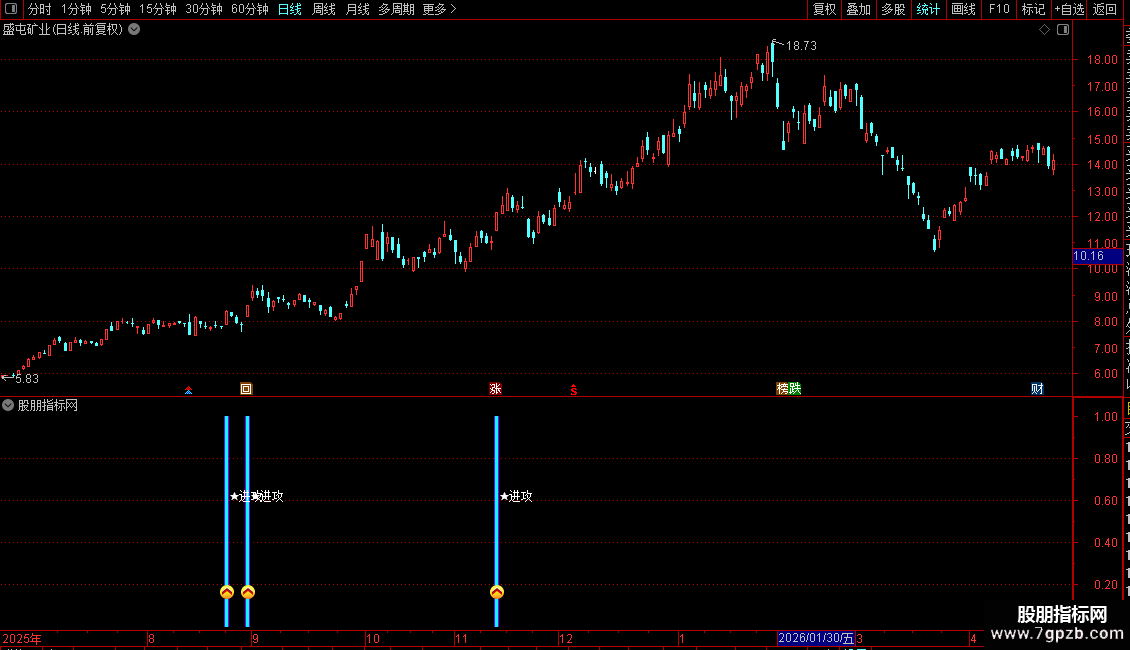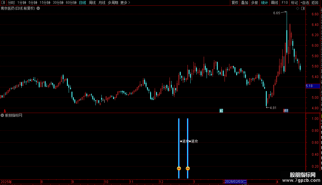 1. 副图指标:安装后副图出现粉色柱状+进攻图标+文字信号,即为标准买入提示,代表个股完成洗盘、放量突破20日压力位,趋势反转。