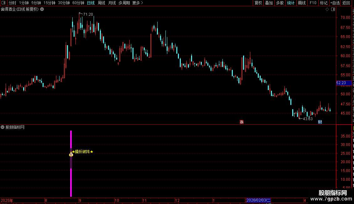 - 副图出现“★擒妖破阵★”文字及彩色柱时,表示满足条件。